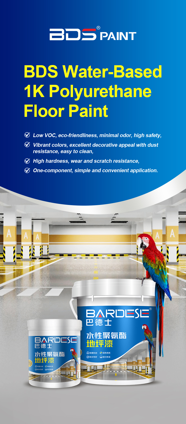 BDS Water-Based 1K Polyurethane Floor Paint is a new flooring product upgraded from water-based acrylic floor paint. It retains the advantages of low odor, easy application, fast drying, and multiple color options, while further enhancing performance. After the coating forms, in addition to preventing concrete dust, decorative color modification, and dirt resistance for easy cleaning, its wear resistance is significantly improved, capable of withstanding moderate-intensity foot traffic and equipment movement. Meanwhile, the coating exhibits superior flexibility, reducing the likelihood of cracking due to minor ground deformation, making it suitable for concrete flooring applications in commercial spaces and medium-sized factories where durability is a key requirement.