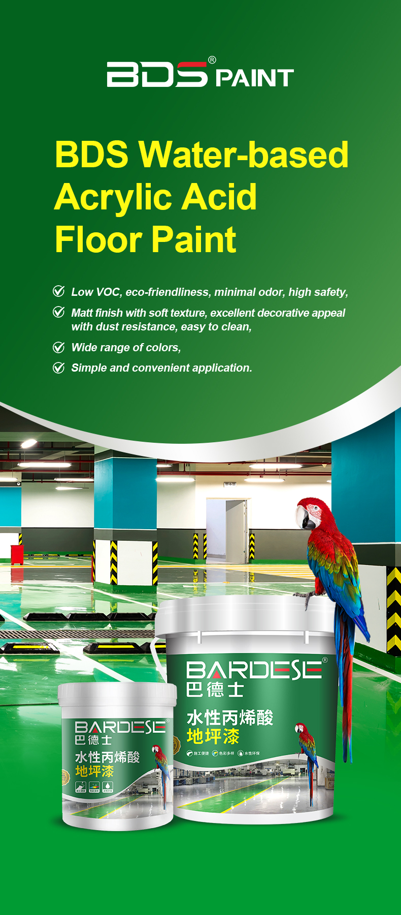 BDS Water-based Acrylic Acid Floor Paint is a single-component DIY floor coating material for home decoration, suitable for concrete floor decoration. No professional team is required, and ordinary users can operate it easily.The product boasts the advantage of low odor, with no irritating fumes during application. It is easy to apply, lowering the operational threshold, allowing even ordinary users to follow step-by-step instructions and achieve quick mastery. With fast drying speed, it can shorten the construction cycle, minimize disruption to daily life, and is safe and environmentally friendly, aligning with the requirements for healthy living. Additionally, it offers a wide range of color options to meet basic decorative needs.After the coating dries, it effectively prevents dusting on concrete while enabling decorative color changes for the floor. It remains resistant to dirt and easy to clean during daily use, maintaining its integrity even under mild wear conditions. It is suitable for residential floors with basic performance requirements or lightly trafficked industrial floors.