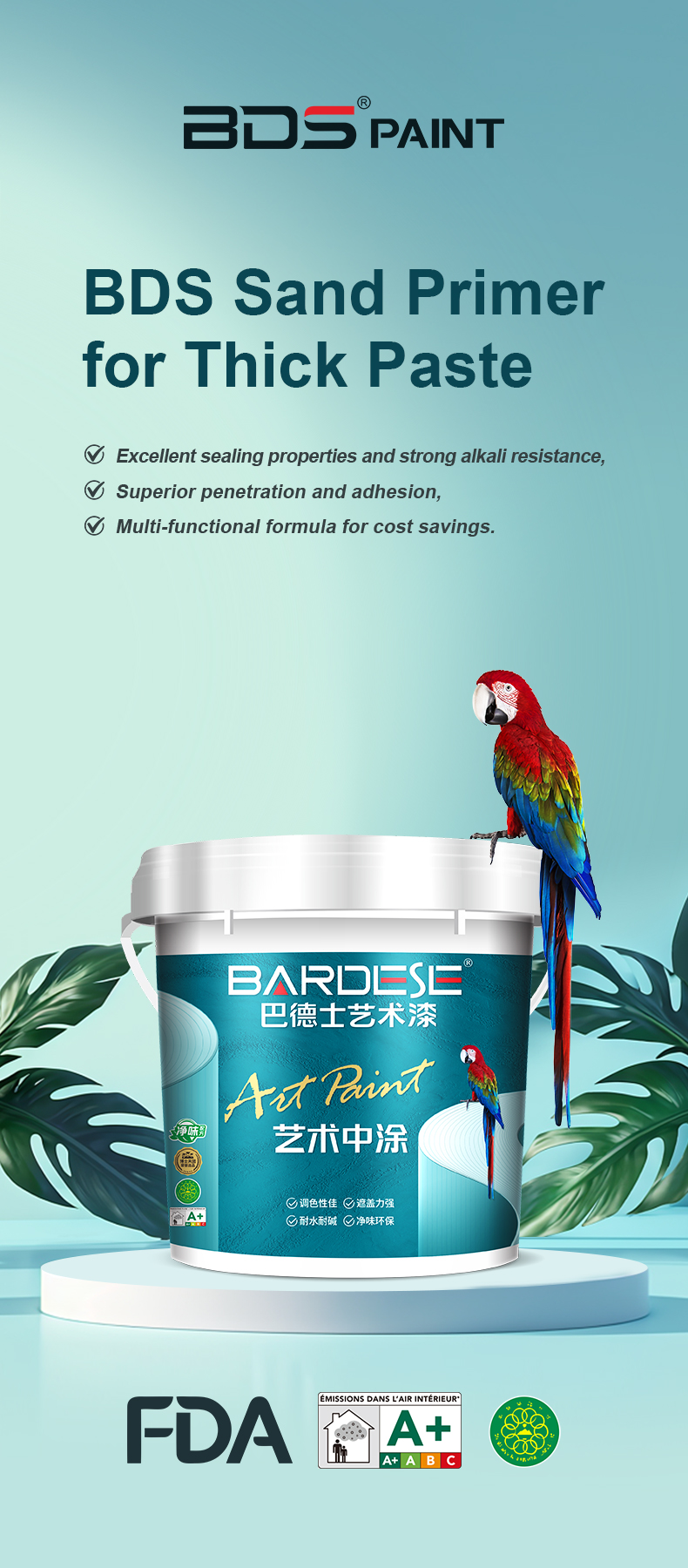 BDS Thick Slurry Yype Special Sand Containing Primeris a closed alkali resistant primer that combines primer and intermediate coating, making the painting process simpler, reducing construction costs, and further improving construction efficiency. The product has strong penetration and sealing properties, which can effectively seal the substrate and make the wall substrate more solid. Not only can it improve the adhesion between coatings, making painting easier during construction, but it also takes into account anti alkali properties, allowing the coating system to achieve optimal results.