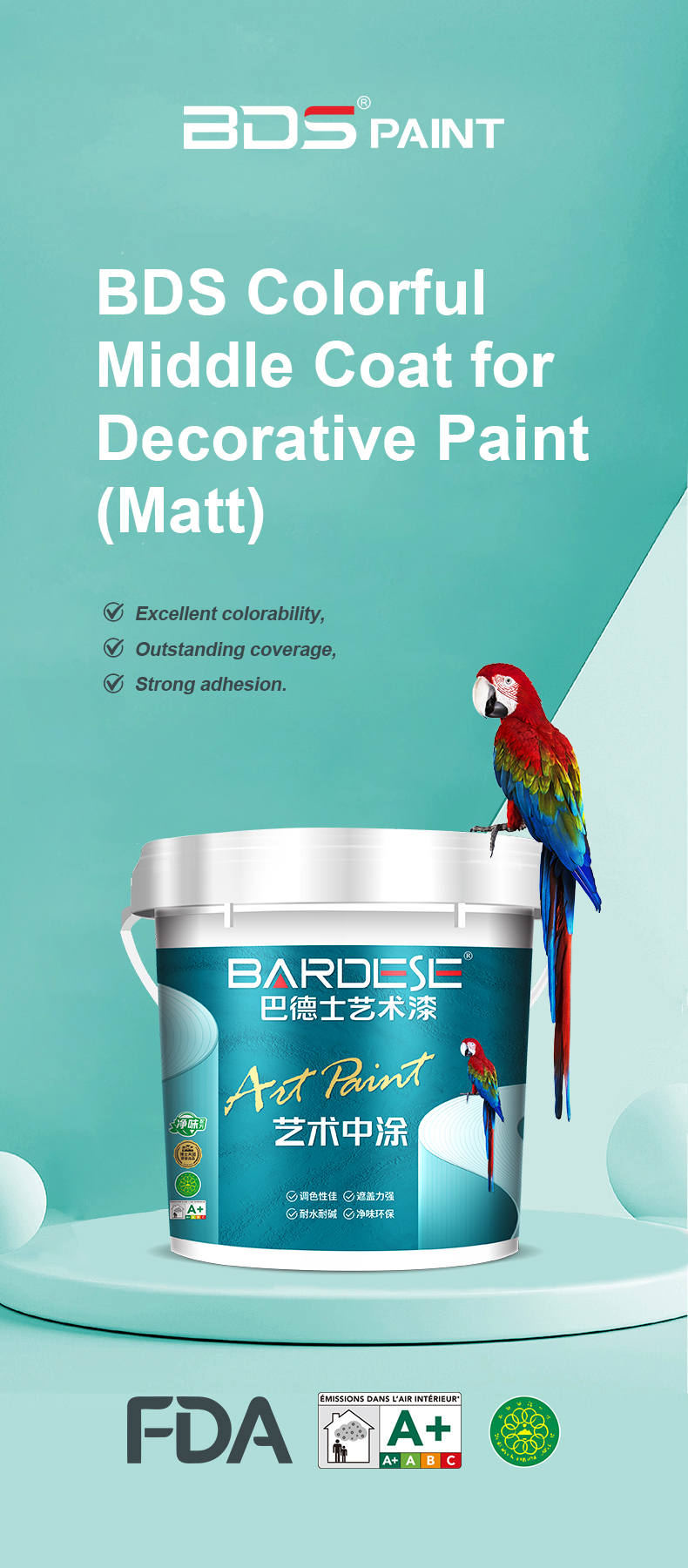 BDS Art Paint Radiance Master (Matte)is an art intermediate coat that focuses on providing color matching for art paint and high coverage for the overall artistic effect. The product has excellent color matching performance, high coverage, and good adhesion with the underlying "artistic paint penetration reinforcement primer". It can effectively help artistic topcoats fully showcase their decorative effects and improve the construction quality of artistic paints.