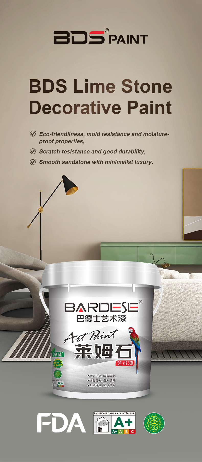 BDS Lime Stone Art Paintis a green and environmentally friendly product developed using raw materials such as quartz sand, nano calcium carbonate, and inorganic minerals. It has excellent properties such as high hardness, water resistance, strong adhesion, and mold and moisture resistance. The new generation of Lime Stone Art Paint is a pure handmade scraping product that embodies the beauty of "nature". It has a natural appearance and a frosted feel, with an antique and elegant effect that returns to simplicity without losing luxury. It can be matched with various colors, materials and techniques to create more paint effects, and has excellent decorative properties. It is widely used in indoor wall decoration.