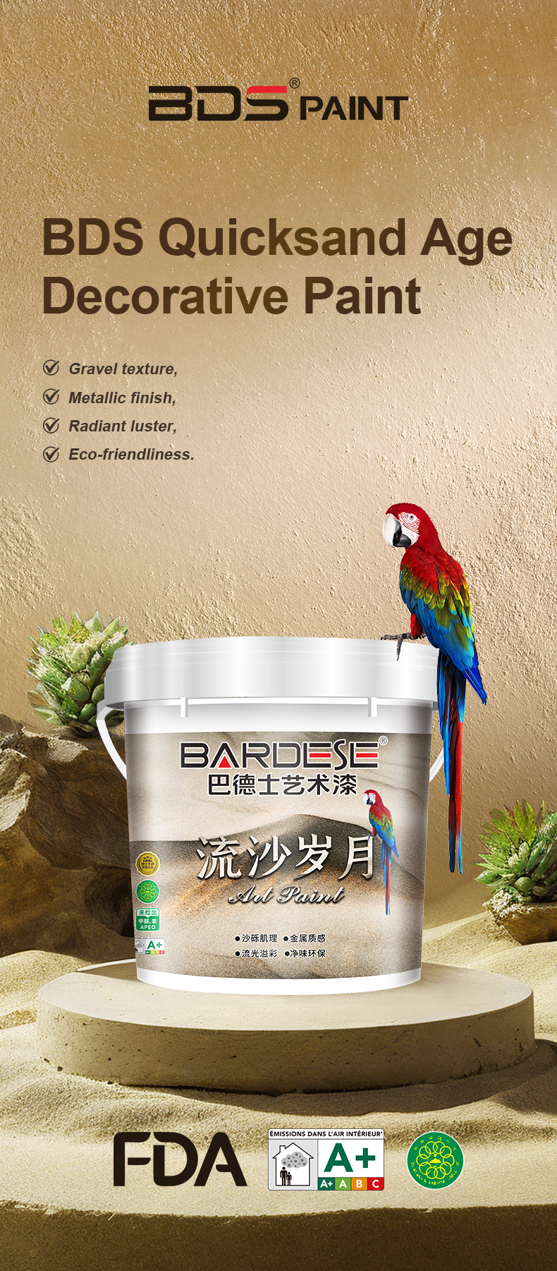 BDS Sandy-Lives Art Paintis a decorative paint composed of acrylic lotion and metallic pearlescent powder, which can create high-end visual effects and unique light and shadow effects. The texture of the gravel is varied in color, resembling the accumulation of sand dunes or the traces left by strong winds blowing through the desert. Easily integrate various home styles, create a warm and comfortable atmosphere, and give the space a delicate and elegant texture like sand.