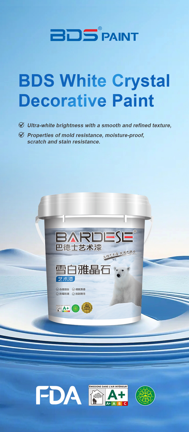 BDS Snow White Elegant Crystal Art Paint is a delicate and unique artistic coating with a simple and elegant texture effect, criss crossing, and can be used for various decorative effects. It also has excellent waterproof and breathable properties, snow-white beauty, high hardness, scrub resistance, mold and moisture resistance, creating a refined and elegant living space for you.