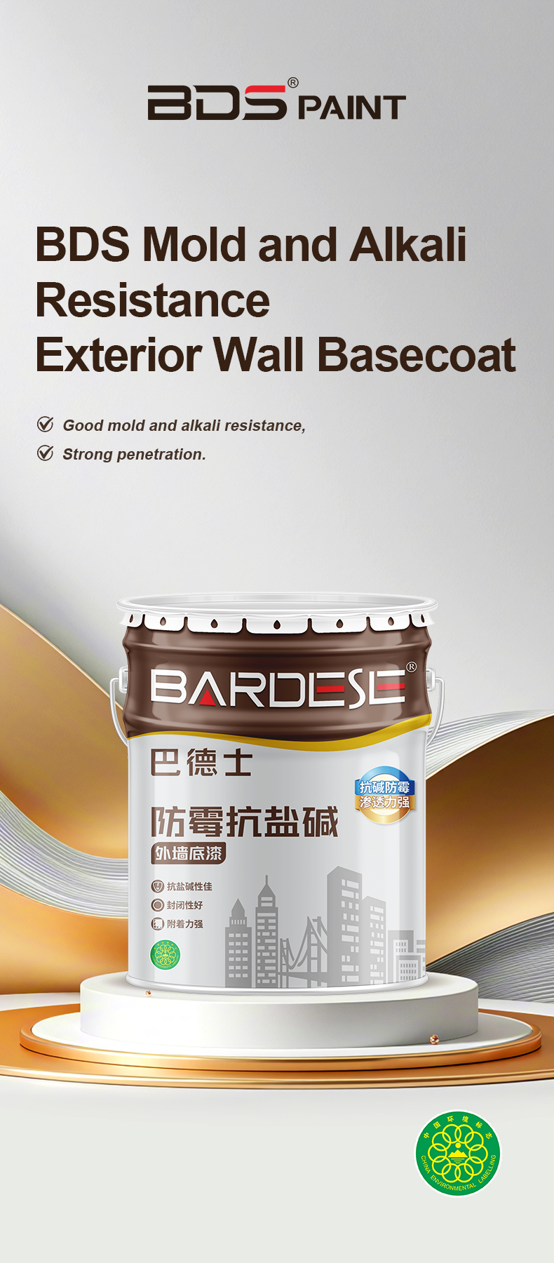 BDS Mold and Alkali Resistance Exterior Wall Basecoat is a professional exterior wall primer with excellent sealing and salt alkali resistance. It can effectively protect the wall paint from the invasion of chemical substances inside the wall, and avoid damage to the performance of the surface paint caused by improper substrate treatment, thus better exerting the effect of the surface paint. Using this product can make the coating fuller, creating a more durable and good finishing effect while using less topcoat.