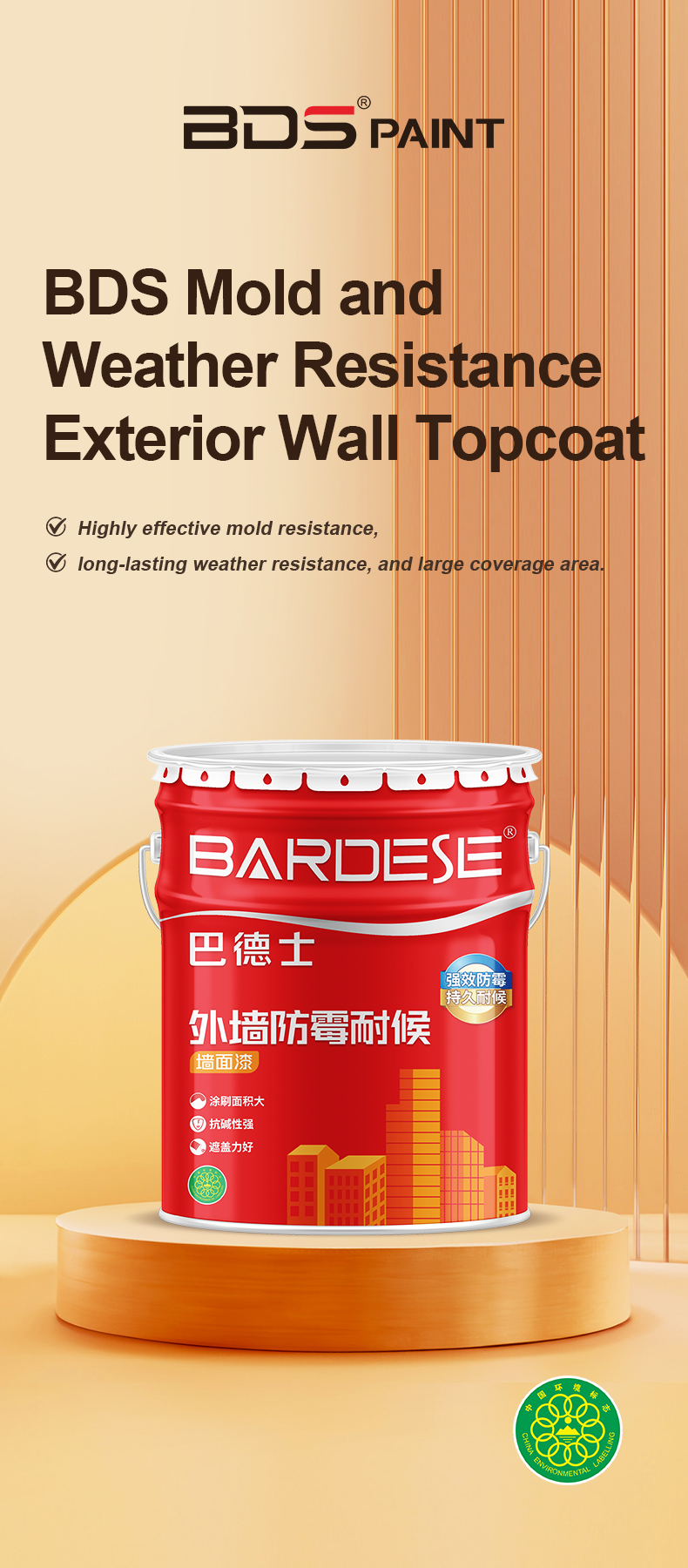 BDS Mold and Weather Resistance Exterior Wall Topcoat is an efficient "anti mold technology" exterior wall decoration material with excellent anti mold performance, which can maintain the long-lasting beauty of the wall surface; Simultaneously possessing good coverage and outdoor weather resistance, it can create long-lasting and excellent coating decoration effects, and effectively extend the service life, making it a quality choice for wall painting and renovation in home and commercial spaces.