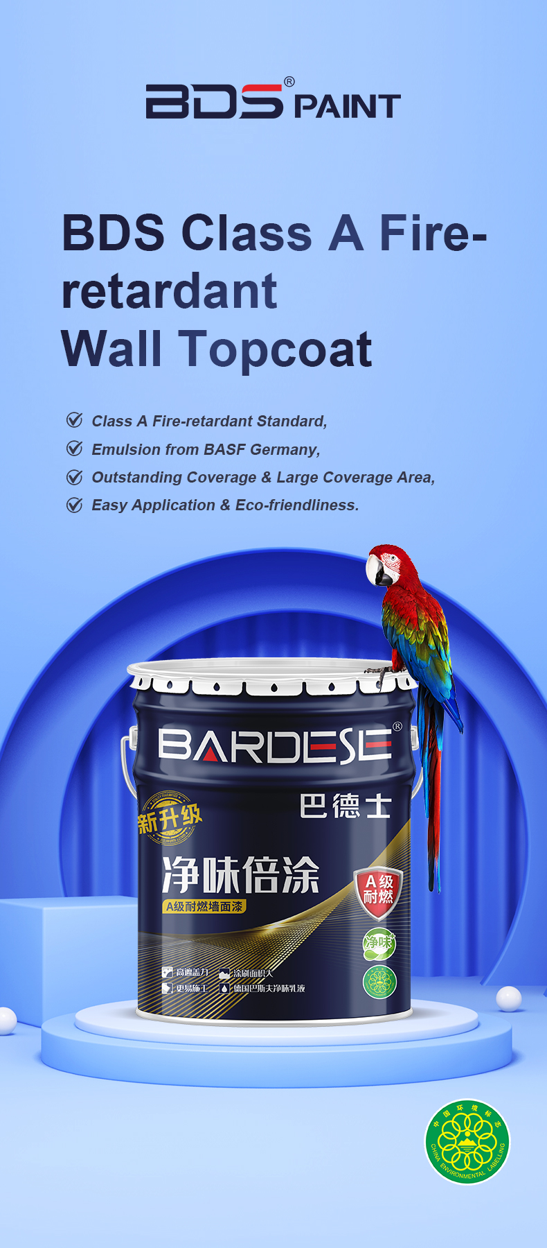 BDS Class A Fire-retardant Wall Topcoatfeatures premium German BASF odorless emulsion, meticulously crafted through automated production processes. This product boasts exceptional coverage, effectively doubling the painting area while delivering superior cost performance. Its clean, healthy formula enhances wall aesthetics, effortlessly creating a fresh and wholesome home environment for you to enjoy.